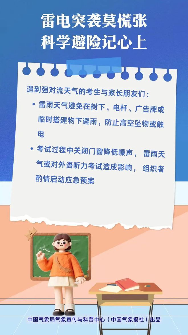 一是注意防范高考期间强降雨、强对流天气影响。建议考生、家长和考务人员密切关注天气变化及气象预警,提前规划行程,加强考点及周边交管保障,并关注8日下午雷电可能对外语听力考试的影响。湘中、湘北等地需防范局地较强降雨或持续降雨可能诱发的山洪、地质灾害、城市内涝等对高考人员安全的影响。