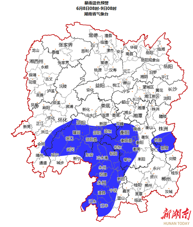 暴雨蓝色预警显示,预计6月8日8时至9日8时,株洲南部、衡阳、邵阳、永州、怀化东南部将出现暴雨,并伴有短时强降水、雷雨大风等强对流天气。