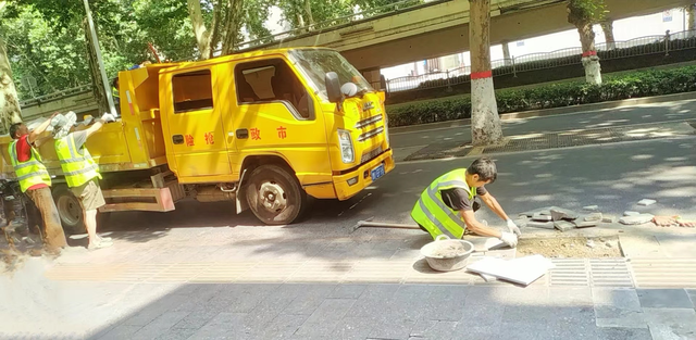 记者在金水路的道路维修现场看到,市政养护工人3人一组,冒着烈日对人行道松动道板进行修复,市政养护工人边敲着木槌边说:“人行道的日常养护,一定要细心、耐心,每一道工序都会影响道板铺装质量。”即便是在树荫下作业,豆大的汗珠顺着脸颊滑落,工作服湿了又干,干了又湿,布满了“盐花”。修复后打扫完路面破碎石板后,又赶往下一处人行道待修复路面了。