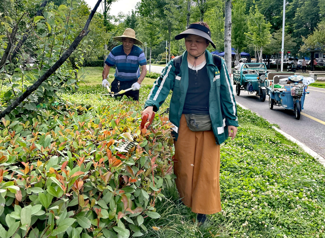 “我们每天清晨6点就上岗作业,避免午间的高温。”杨玉霞说,每天早早的乘着清凉到中午11点左右进行着修剪、除草、浇水,确保园林绿植能够在高温天气下依旧焕发生机。