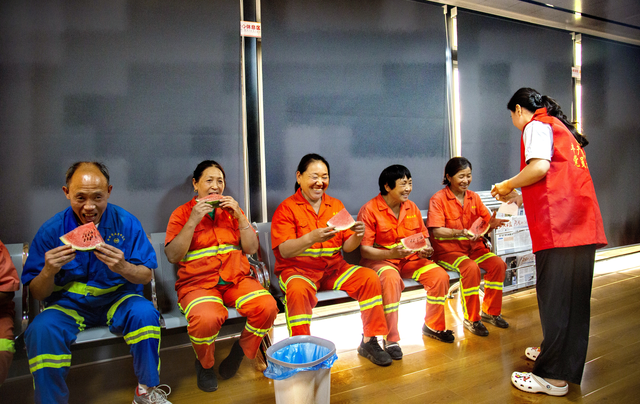 “我们不断延伸“爱心驿站”服务“触角”,高温天气下,本着“热心、用心、精心、爱心、贴心、暖心”的原则,各驿站纷纷推出接地气、聚人气的‘夏送清凉’活动,为一线户外劳动者准备西瓜、绿豆汤、矿泉水、藿香正气水等防暑降温物资等解暑物资,使之真正成为户外劳动者遮风避雨的‘温馨港湾’,让‘爱心驿站’变得更有温度。”金水区城管局环卫事务中心相关负责人对记者说。