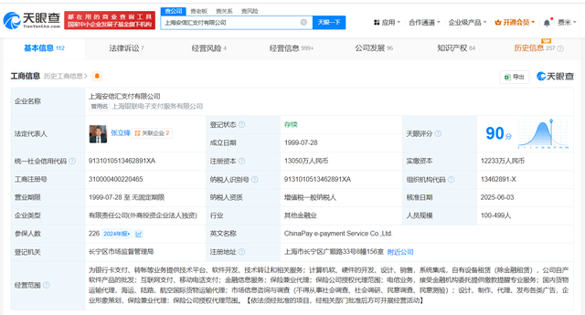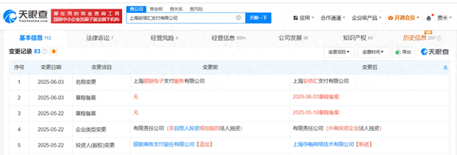 天眼查App显示,近日,上海银联电子支付服务有限公司发生工商变更,企业名称变更为上海安信汇支付有限公司。此前,该公司原股东银联商务支付股份有限公司退出,新增上海夺畅网络技术有限公司为全资股东。该公司成立于1999年7月,法定代表人为张立锋,注册资本约1.31亿人民币,经营范围包括为银行卡支付、转帐等业务提供技术平台、软件开发、技术转让和相关服务等。