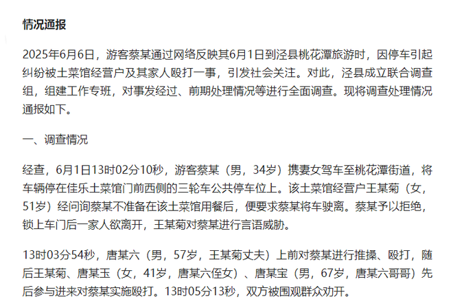 泾县游客被打事件处理结果发布,处理5名公职人员,游客获得赔偿