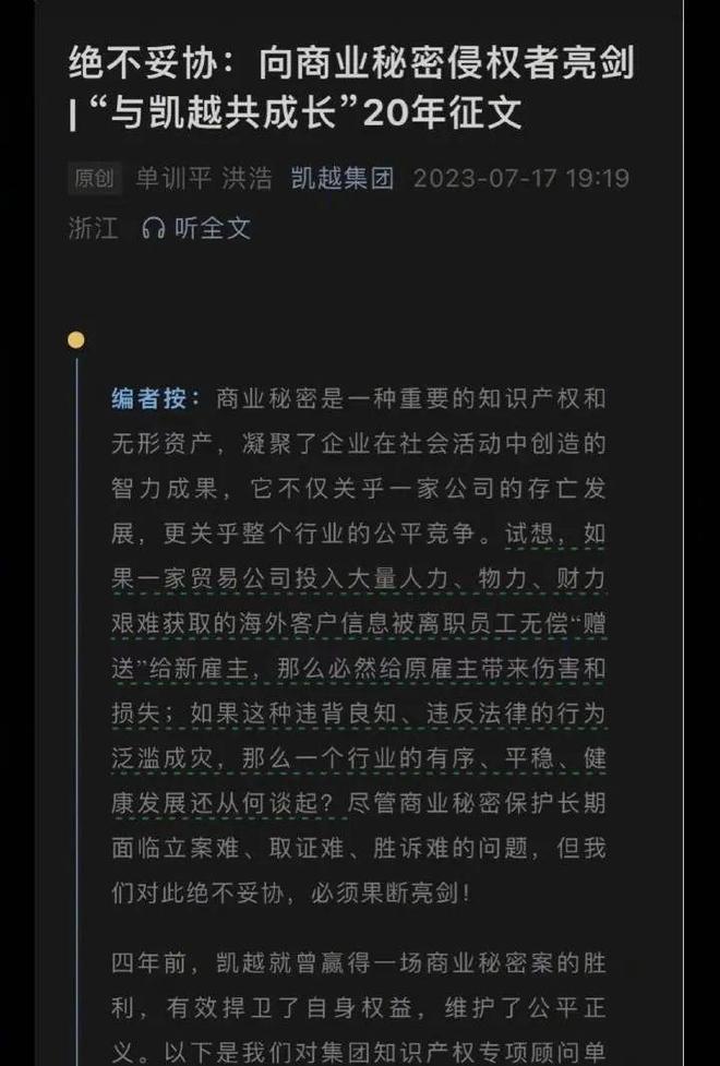 通过查看“凯越集团”的微信公众号,指尖新闻记者看到该公号2023年7月17日的确发布了一篇《绝不妥协:向商业秘密侵权者亮剑》的文章,文章中也的确写明有离职员工因为商业秘密侵权被判刑。