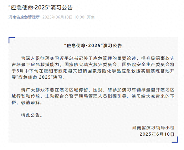 6月10日,记者从省应急管理厅获悉,国家防灾减灾救灾委员会、国务院安全生产委员会将于6月中下旬在濮阳市濮阳县文留镇国家危险化学品应急救援实训演练基地开展“应急使命·2025”演习。演练准备期间和正式演习阶段,可能会有真火演练,请周边群众不必惊慌。河南省演习领导小组提醒,届时请广大群众不要在演习区域停留、围观,非参加演习车辆尽量避开演习区域行驶和停放,主动配合交警等现场管理人员指挥引导。