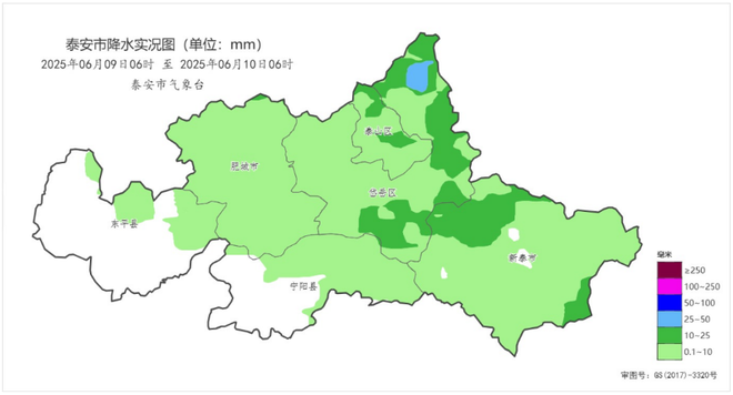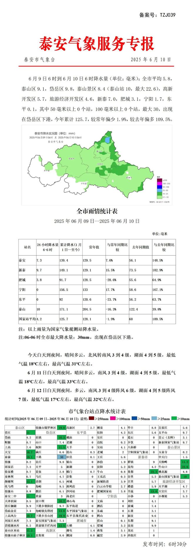 6月9日6时到6月10日6时降水量(单位:毫米):全市平均5.8,泰山区9.1,岱岳区9.8,泰山景区8.4(泰山站10,最大22.6),高新开发区5.7,旅游经济开发区4.6,新泰7.0,肥城3.1,宁阳1.7,东平0.1,最大30,出现在岱岳区下港,今年累计125.7,较常年(128.1)偏少1.9%,较去年(60)偏多109.5%。