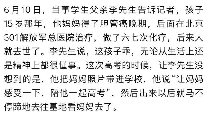 说起来这孩子也挺不容易。他十五岁那年,妈妈被查出胆管癌晚期,在北京301医院做了六七次化疗,终究还是没留住。其父亲告诉记者,这孩子打小就懂事,生活上从不让人操心,妈妈生病那几年,放学回家还会给爸爸搭手做饭。谁也没想到,高考这天,他偷偷把妈妈的照片用别针别在校服上,进考场前还跟监考老师说明了情况:“想让妈妈陪我一起考。”老师瞅着照片没字没画的,也就默许了。后来有人问他咋想的,他说得特别简单:“以前模拟考妈妈都会在考场外等着,这次她来不了,我就带她来。”