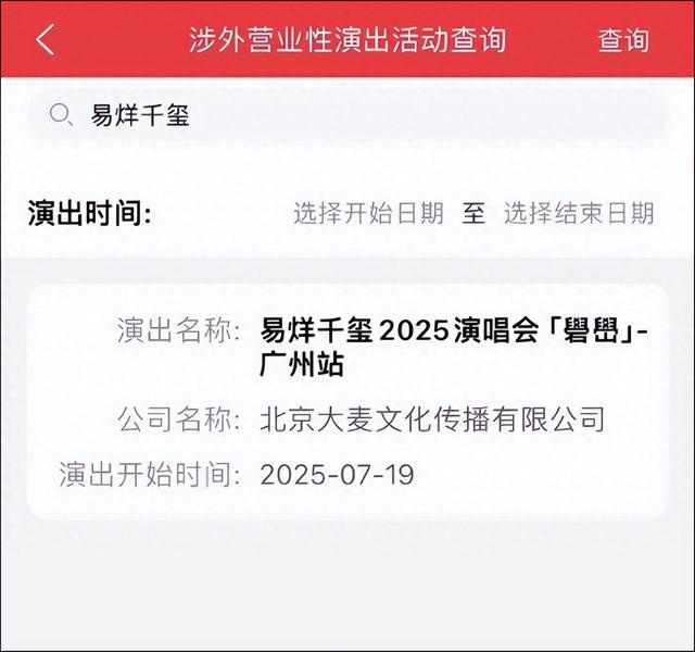 6月11日,记者查询文旅市场通发现,易烊千玺演唱会广州站已获批,定档7月19日开唱,演唱会主题为礐嶨。据悉,易烊千玺上一次个人演唱会是2019年举办的“易烊千玺2019玊尔演唱会”。玊(sù),原意指有疵点的玉,也指琢玉的工人。网络用语中,“玊尔”意指独一无二的自己。