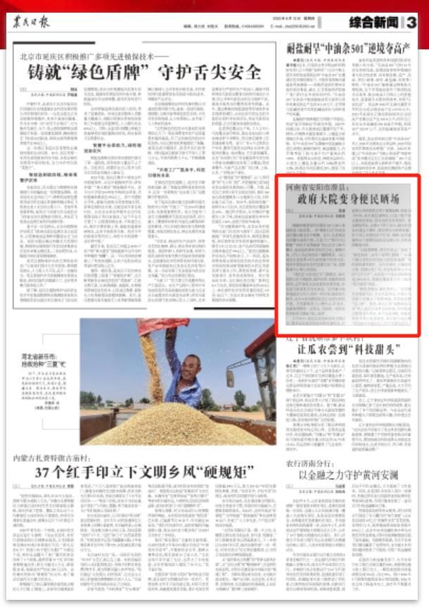 今天出版的《农民日报》报道了,河南省安阳市滑县瓦岗寨乡政府大院变身便民晒场的故事。