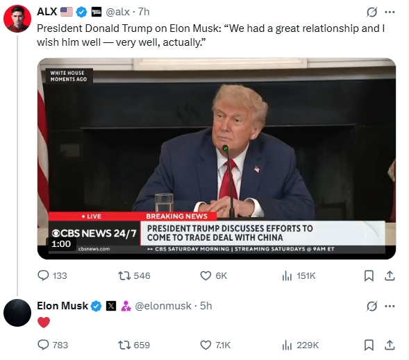 但周一马斯克在X平台上回应了一段特朗普的采访视频片段后,双方关系似乎有所缓和。
