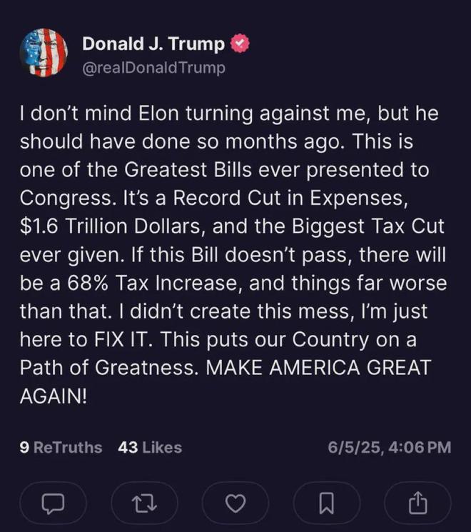 在另一条帖子中,特朗普表示:“我不在乎伊隆与我为敌,但他本应几个月前就这么做。这是提交给国会的最伟大的法案之一。这是创纪录的支出削减,1.6万亿美元,也是有史以来最大的减税措施。”