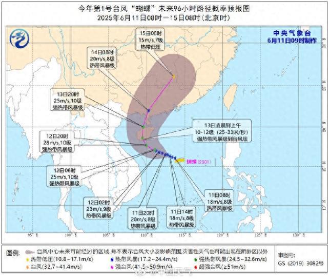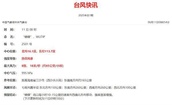 6月11日8时前后,南海热带低压增强为今年第1号台风“蝴蝶”(热带风暴级,英文名称:WUTIP;名字来源:中国澳门;名字意义:一种昆虫)。预计“蝴蝶”将于13日在海南岛南部到广东西部一带沿海登陆。