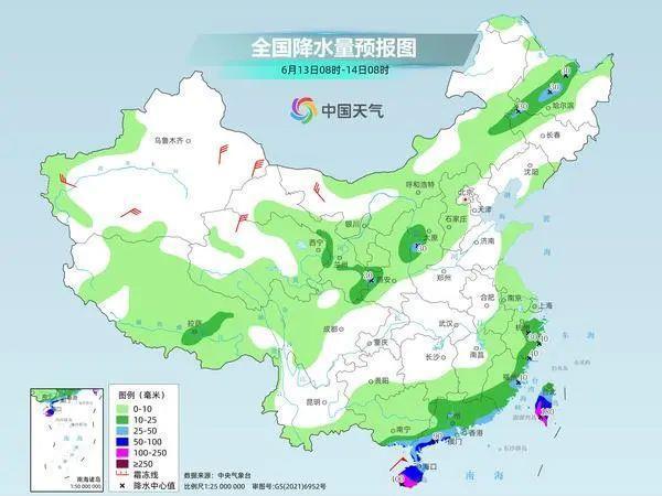 6月13日8时至14日8时,广西南部、广东中南部、海南岛、福建东部、浙江东部、台湾岛等地部分地区有大到暴雨,其中,海南岛南部、台湾岛南部等地部分地区有大暴雨,局地特大暴雨(250~400毫米)。上述部分地区伴有短时强降水(最大小时降雨量20~50毫米,局地可超过70毫米),局地有雷暴大风等强对流天气。