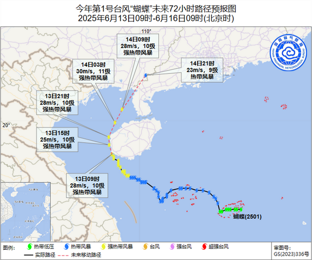 预计6月13日8时至14日8时,南海大部、北部湾、琼州海峡、西沙群岛、南沙群岛、中沙群岛、广东沿海、海南岛沿海、广西沿海将有6-8级风,阵风9-10级,台风中心经过的附近海域风力可达9-11级,阵风12-14级。