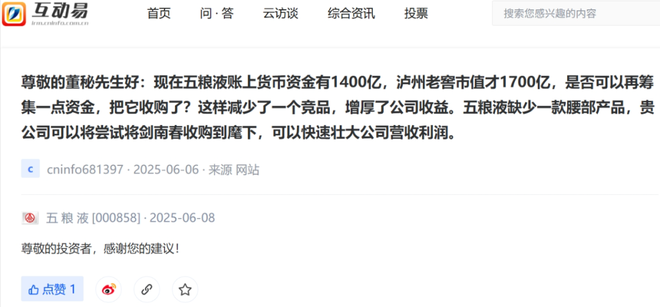6月6日,有人在深交所互动易上对五粮液董秘说:“ 现在五粮液账上货币资金有1400亿,泸州老窖市值才1700亿,是否可以再筹集一点资金,把它收购了?这样减少了一个竞品,增厚了公司收益。”