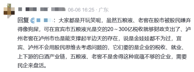 在讨论帖下,这名疑似提议者说泸州市政府不会同意卖掉 泸州老窖的,因为“泸州老窖在泸州市也是能支撑起半边天的存在,说是金娃娃都不为过。”