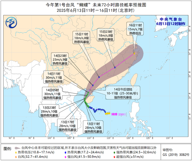 今年第1号台风“蝴蝶”(热带风暴级)已于昨天(12日)晚上加强为强热带风暴级。预计,“蝴蝶”将以每小时10公里左右的速度向偏北方向移动,紧擦海南岛西部近海北上,之后将于14日中午前后在广东徐闻到广西北海一带沿海登陆(强热带风暴级,10-11级,25-30米/秒),登陆后转向东北方向移动,强度逐渐减弱。