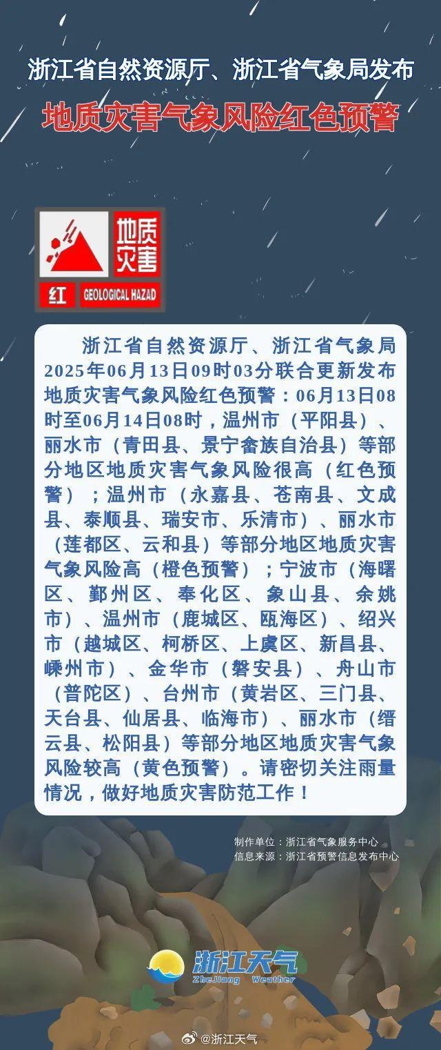 浙江省自然资源厅、浙江省气象局2025年06月13日09时03分联合更新发布地质灾害气象风险红色预警: