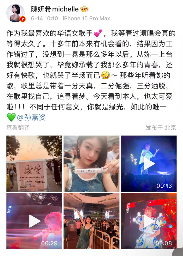 6月14日,陈妍希发文称自己去看了最喜欢的华语女歌手孙燕姿的演唱会,十分感慨,竟哭了半场。据悉,孙燕姿演唱会13日和15日在北京鸟巢举行。