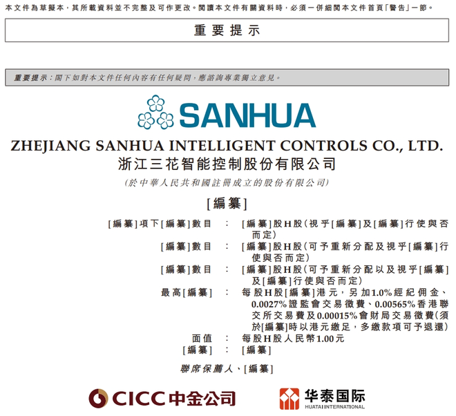据了解,三花智控以每股21.21港元至22.53港元的价格发行H股,并有权扩大交易规模。
