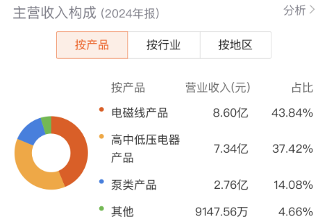 根据公司2024年年报,百利电气的电磁线产品、高中低压电器产品、泵类产品的营收占比分别为43.84%、37.42%、14.08%,这些产品的销售收入构成公司的主要收入来源。但是,受行业整体需求疲弱的影响,百利电气的主营业务增长乏力,使得公司的经营承受着极大的压力。