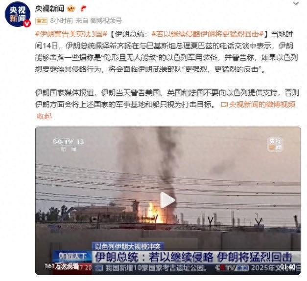 当地时间14日,伊朗总统佩泽希齐扬在与巴基斯坦总理夏巴兹的电话交谈中表示,伊朗能够击落一些据称是“隐形且无人能敌”的以色列军用装备,并警告称,如果以色列想要继续其侵略行为,将会面临伊朗武装部队“更强烈、更猛烈的反击”。