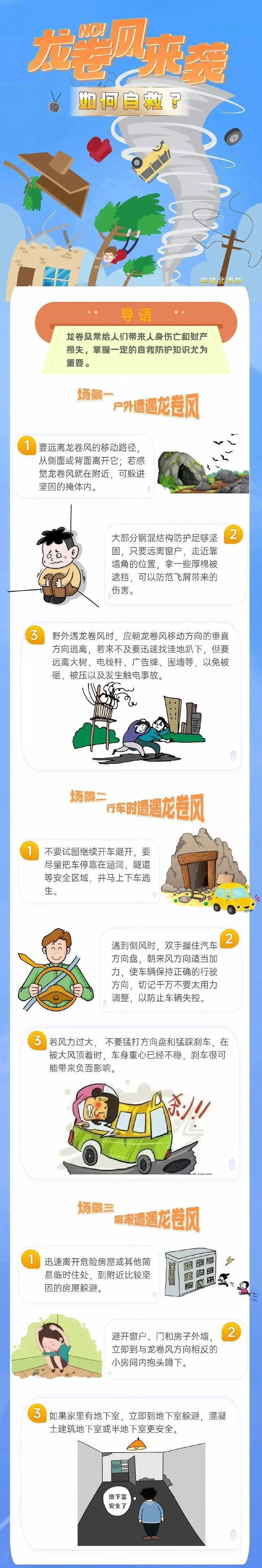 当龙卷风袭来,如果身处户外,要观察龙卷风动态,及时避开其行进路径;远离大树、电线杆、广告牌、高围墙等,以免被砸、被压。如果身处室内,要远离门、窗和房屋的外围墙壁,最安全的地方是地下室或者半地下室。如果出现房屋倒塌等紧急情况,应尽可能切断电源,以防触电或引起火灾。