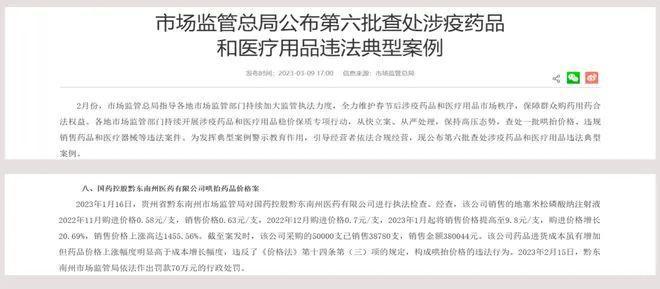 据2023年3月9日市场监管总局通报,国药控股黔东南州医药有限公司曾将地塞米松磷酸纳注射液的售价提高1455.56%,最终被罚款70万元。