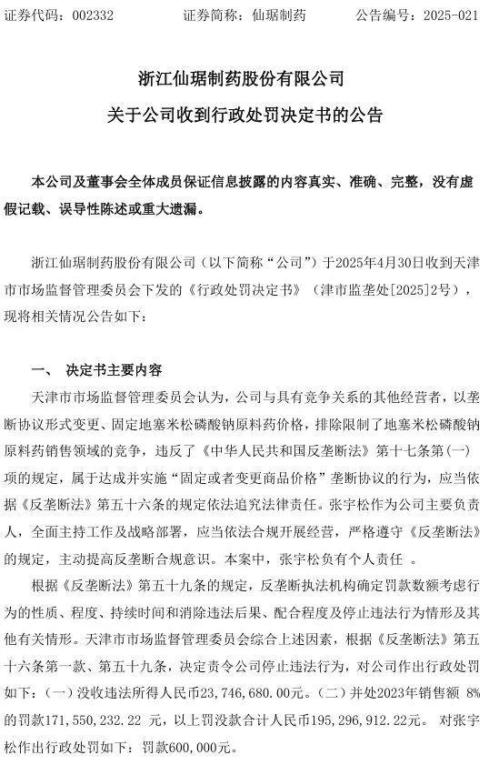 从披露细节来看,加上被罚没2877.92万元的西安国康瑞金制药有限公司,四家涉事药企业中,仙琚制药被罚金额最大,合计约1.95亿元。其中,仅2023年销售额8%的罚款就高达1.72亿元。