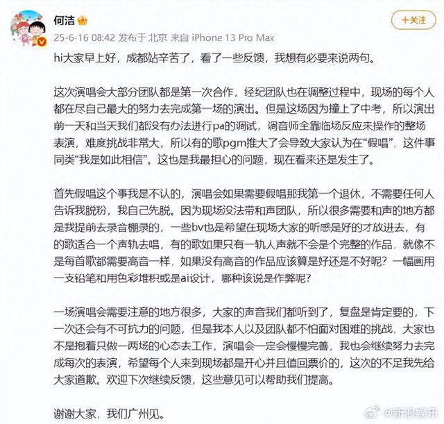 16日,何洁发长文回应近期假唱争议,她表示因演唱会撞上中考,演出的前一天和当天无法提前进行调试,所有的歌推大了pgm令大家认为在假唱,“假唱这个事我是不认的,演唱会如果需要假唱那我第一个退休,不需要任何人告诉我脱粉,我自己先脱。”她表示会继续复盘完善,欢迎大家继续反馈。该微博很快被删除。
