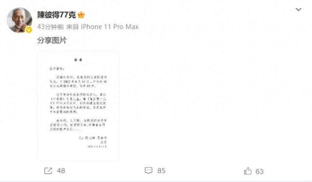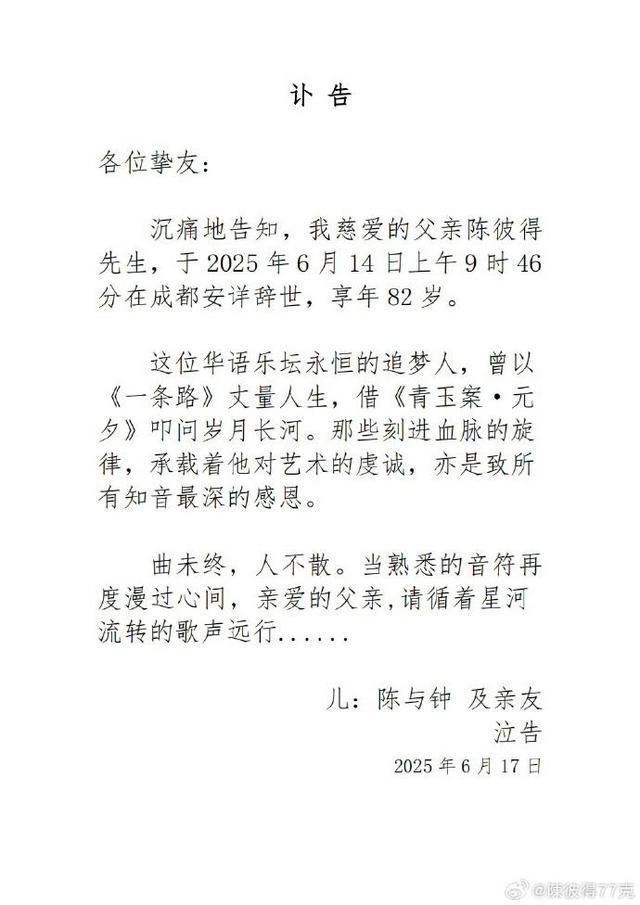 6月17日,陈彼得之子发布讣告,其父陈彼得于2025年6月14日上午9时46分在成都安详辞世,享年82岁。