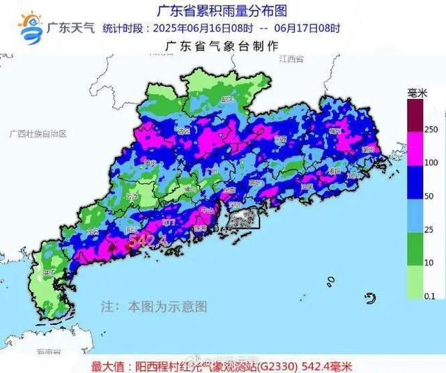 据悉,按照气象学对于不同等级降水的雨量划分,24小时内累积雨量超250毫米,已达特大暴雨级别。阳江阳西县程村镇24小时累积542.4毫米,相当于24小时内下了两场特大暴雨。
