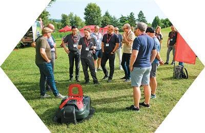 在意大利博洛尼亚举行的经销商会议上,外国客商正围在格力博生产的AiConic智能割草机器人旁观察产品性能。 杨 旻摄