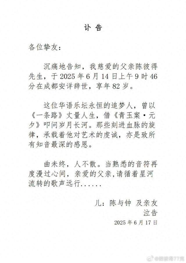 沉痛地告知,我慈爱的父亲陈彼得先生,于2025年6月14日上午9时46分在成都安详辞世,享年82岁。