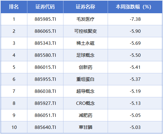 在板块方面,本周涨幅居前的概念板块包括PET铜箔、PCB、页岩气、MicroLED以及先进封装等,累计涨幅分别为4.97%、4.37%、3.76%、3.46%以及2.72%,而排在跌幅榜前列的概念板块包括毛发医疗、可控核聚变、稀土永磁、足球以及创新药等概念,累计跌幅分别为7.38%、5.90%、5.69%、以及5.5%。
