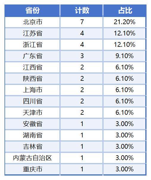 从地域分布看,按照省份划分,北京有7家,占比21.2%;江苏、浙江各有4家,占比12.1%;广东有3家,占比9.1%。