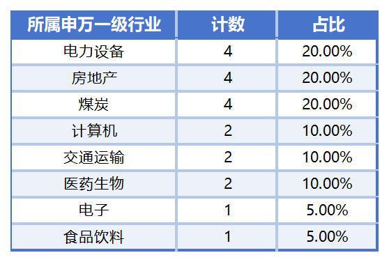 从行业分布看,按照申万一级行业分类,电力设备、房地产、煤炭各有4家,占比20%;计算机、交通运输、医药生物各有2家,占比10%。