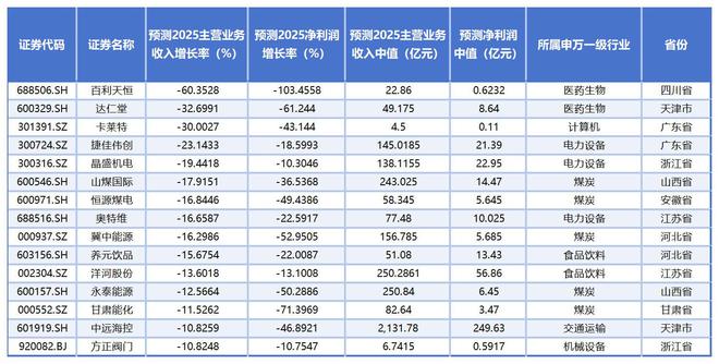 值得关注的是,预测2025主营业务收入增长率、净利润增长率下滑幅度均超过10%的有15家上市公司,具体包括百利天恒、达仁堂、卡莱特、捷佳伟创、晶盛机电、山煤国际、恒源煤电、奥特维、冀中能源、养元饮品、洋河股份、永泰能源、甘肃能化、中远海控、方正阀门。