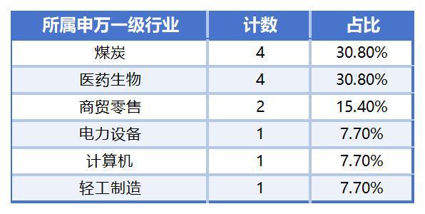 从行业分布看,按照申万一级行业分类,煤炭、医药生物各有4家,占比30.8%;商贸零售有2家,占比15.4%。