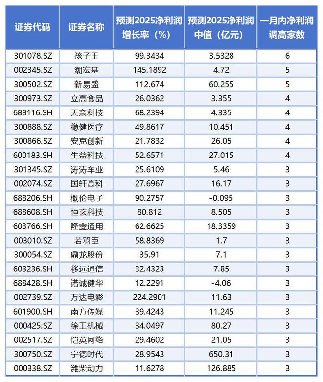 此外,23家上市公司预测净利润获3家及以上机构调高。其中,孩子王、潮宏基、新易盛或较多机构青睐。